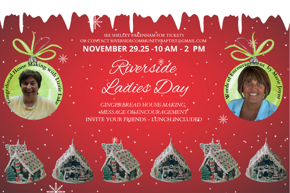 Ladies Day - We had so much fun at our Valentine's Ladies Day, we decided to do a Christmas one, too. We will be decorating Gingerbread Houses, homemade by the talented Lizze Lake, enjoying another fabulous lunch by the chefs in our church and then hearing a word of encouragement by the dynamic author and speaker, Marie Joynt. This event is free, but we need to know numbers a week before. Please contact Shelley Pakenham or riversidecommunitybaptist@gmail.com to receive your complimentary ticket.